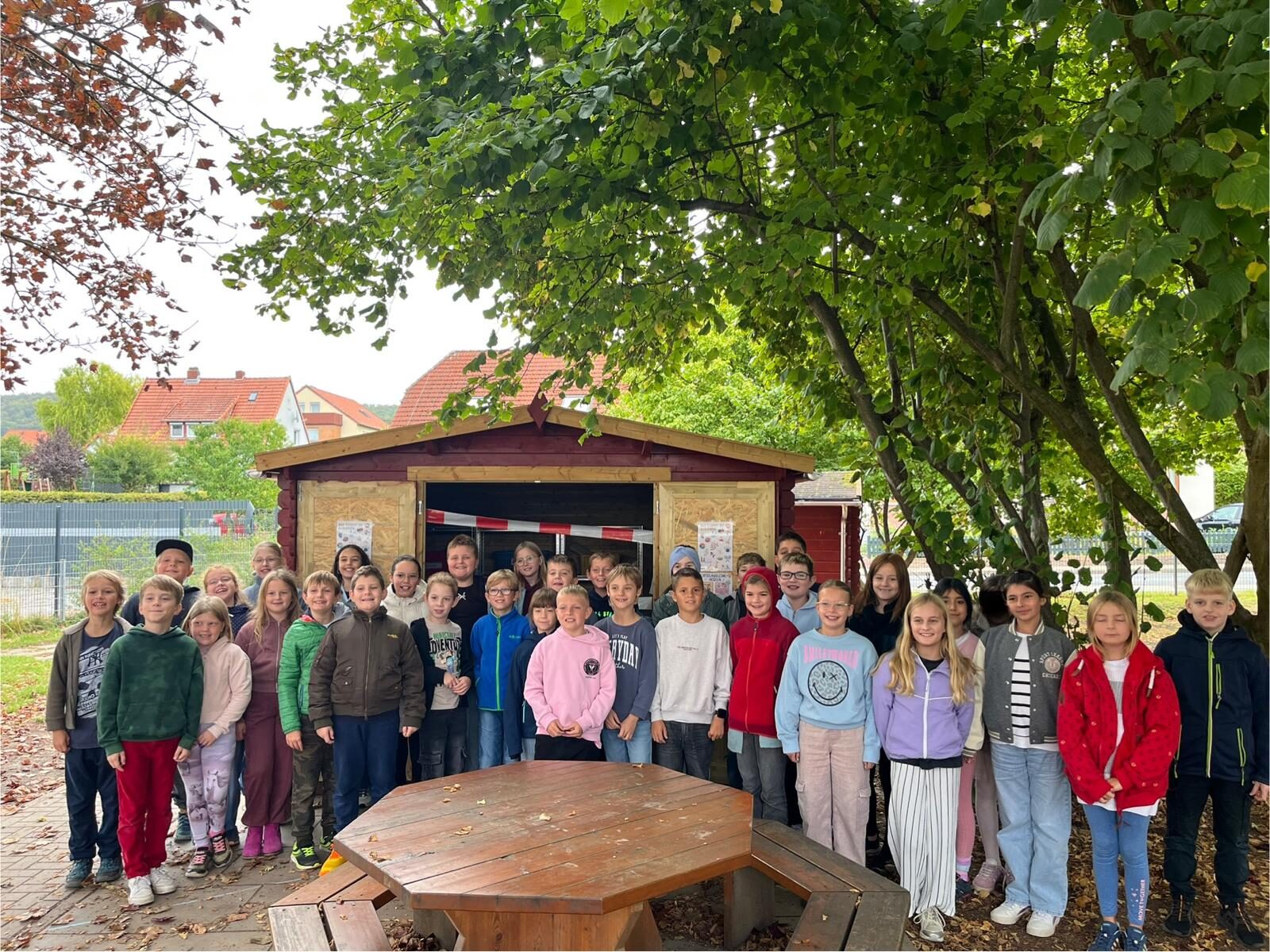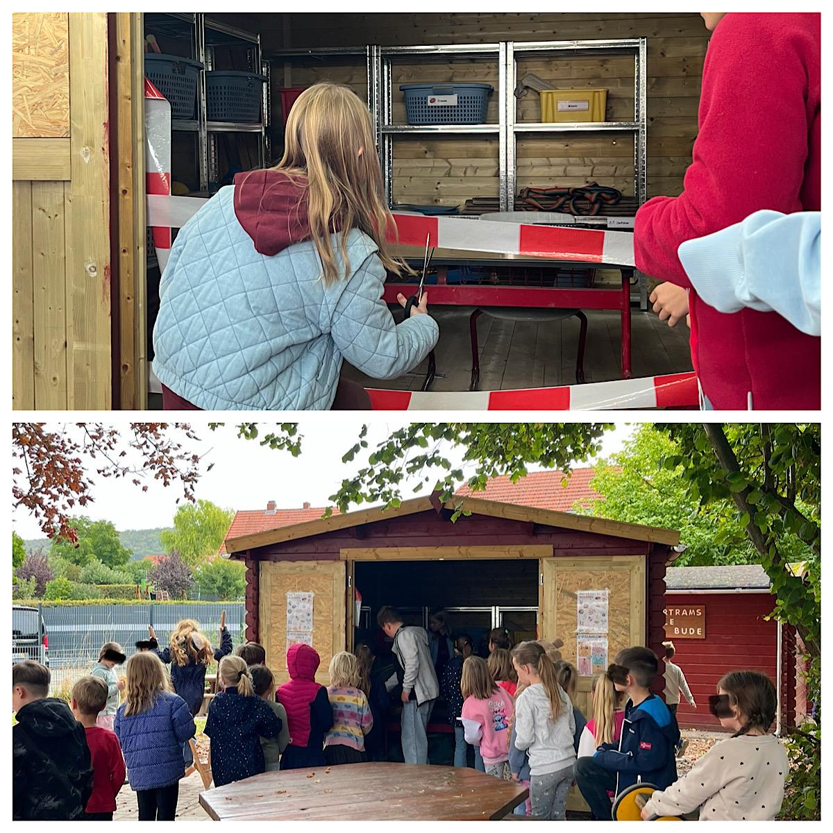 Am 22.09. erlebten alle Schülerinnen und Schüler eine besonders gelungene erste Pause des Vormittags. Vor der Schule wurde das neue Spielehäuschen feierlich eröffnet. Viele Kinder führten einen Countdown durch, bevor das Band von Viertklässlerinnen und Viertklässlern zerschnitten wurde. Die Freude war groß. Die Kinder jubelten und direkt zu Beginn der Pause bildete sich eine lange Schlange zum Ausleihen der Spielgeräte.